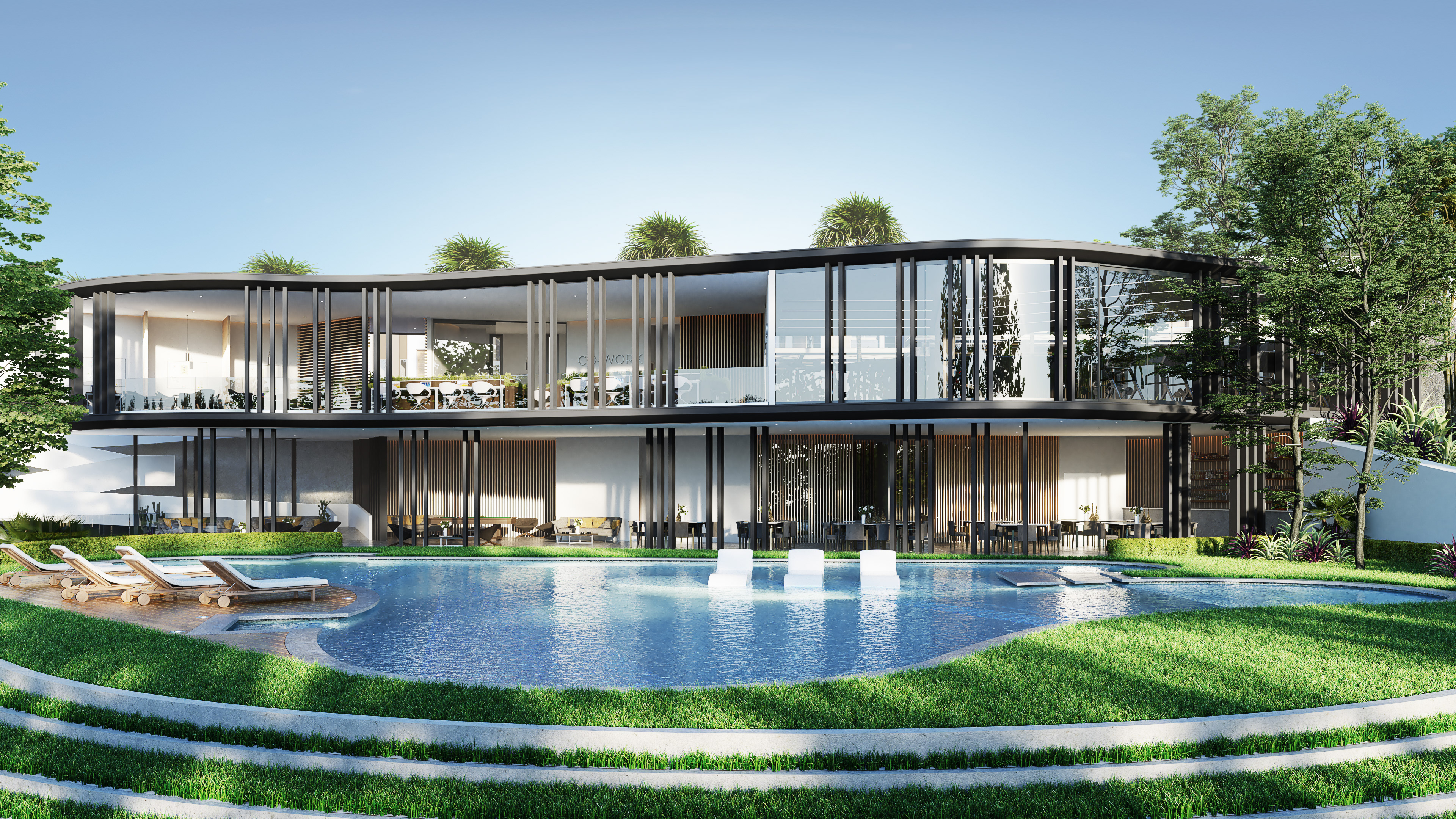 Propuesta A del proyecto Arquitectonico de para el area social del conjunto residencial Vista Santa Ana. contemplando un diseño moderno y minimalista con uso de colores neutros y materiales en su maxima expresion